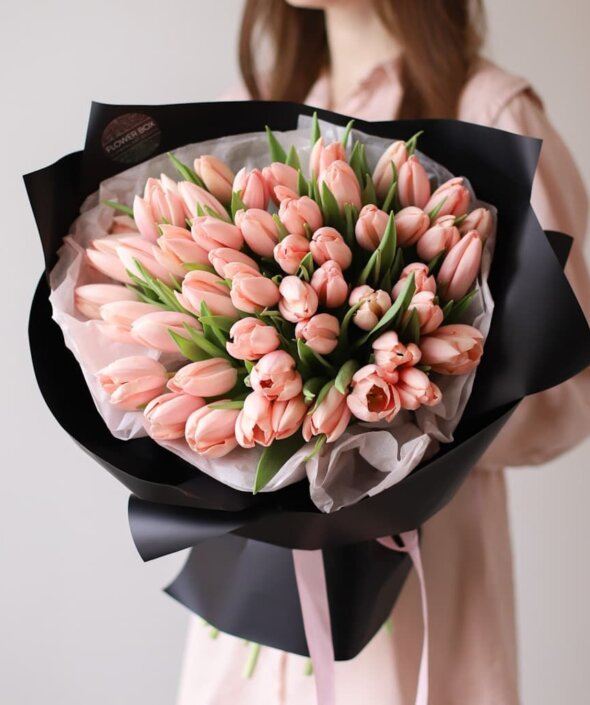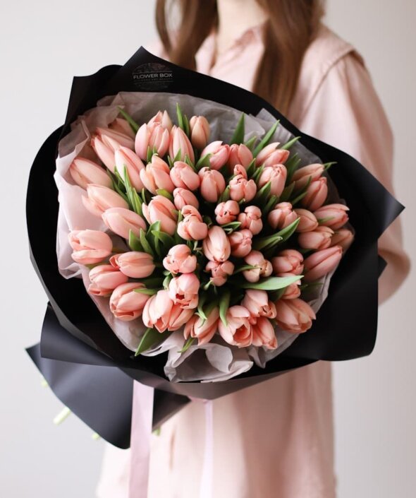 Лососевые тюльпаны в черном оформлении (51 шт) №1595