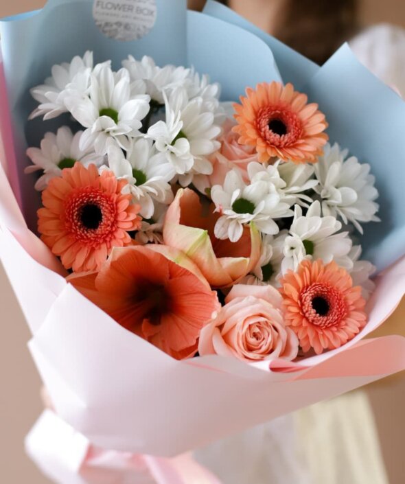 - В композиции могут быть цветы с разной стойкостью — аккуратно удаляйте увядшие, чтобы сохранить красоту букета дольше.